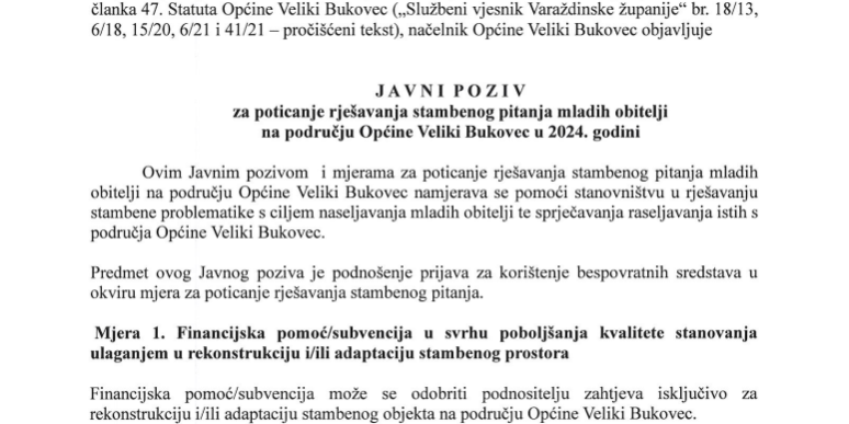lip112024NovostiJavni poziv za poticanje rješavanja stambenog pitanja mladih obitelji na području Općine Veliki Bukovec u 2024. godini Izjava-podnositelja-o-prvoj-nekretnini Obrazac 1 – Prijavni obrazac Obrazac-2- Izjava za suvlasnika Obrazac 3 – Privola za obradu osobnih podataka Category: Novostiod Općina Veliki Bukovec11. lipnja 2024. Share this post Share on FacebookShare on Facebook Share on LinkedInShare on LinkedIn Share on WhatsAppShare on WhatsApp Pin itShare on Pinterest Author: Općina Veliki Bukovec Post navigationPreviousPrevious post:Javni poziv za predlaganje kandidata za dodjelu javnih priznanja Općine Veliki Bukovec u 2024. godiniNextNext post:Javni poziv poduzetnicima 2024Related PostsANKETNI UPITNIK – Strategija zelene urbane obnove Općine Veliki Bukovec28. listopada 2025.DODJELA STIPENDIJA UČENICIMA S PODRUČJA OPĆINE VELIKI BUKOVEC ZA ŠKOLSKU GODINU 2025./2026.13. listopada 2025.Obavijest o provođenju sustavne deratizacije Veliki Bukovec9. listopada 2025.OBAVIJEST – PRIJAVA ŠTETE OD SUŠE ZA OSIGURANE POVRŠINE13. kolovoza 2025.JAVNU RASPRAVU o Prijedlogu izmjene i dopune Prostornog plana uređenja Općine Veliki Bukovec8. kolovoza 2025.Obavijest o podnošenju prijava od prirodne nepogode suše7. kolovoza 2025.