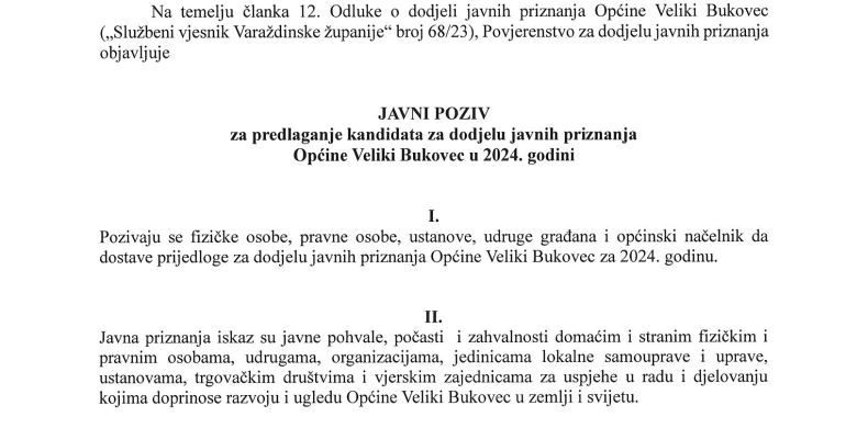 svi292024NovostiJavni poziv za predlaganje kandidata za dodjelu javnih priznanja Općine Veliki Bukovec u 2024. godini Obrazac za predlaganje kandidata za dodjelu javnih priznanja Category: Novostiod Općina Veliki Bukovec29. svibnja 2024. Share this post Share on FacebookShare on Facebook Share on LinkedInShare on LinkedIn Share on WhatsAppShare on WhatsApp Pin itShare on Pinterest Author: Općina Veliki Bukovec Post navigationPreviousPrevious post:O G L A S za upis djece u program Dječjeg vrtića „Krijesnica“ za pedagošku godinu 2024./2025.NextNext post:Javni poziv za poticanje rješavanja stambenog pitanjaRelated PostsJAVNI NATJEČAJ – zimska služba12. studenoga 2025.ANKETNI UPITNIK – Strategija zelene urbane obnove Općine Veliki Bukovec28. listopada 2025.DODJELA STIPENDIJA UČENICIMA S PODRUČJA OPĆINE VELIKI BUKOVEC ZA ŠKOLSKU GODINU 2025./2026.13. listopada 2025.Obavijest o provođenju sustavne deratizacije Veliki Bukovec9. listopada 2025.OBAVIJEST – PRIJAVA ŠTETE OD SUŠE ZA OSIGURANE POVRŠINE13. kolovoza 2025.JAVNU RASPRAVU o Prijedlogu izmjene i dopune Prostornog plana uređenja Općine Veliki Bukovec8. kolovoza 2025.