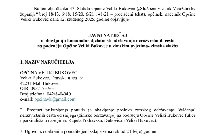Pročitaj višeJavni natječaj za obavljanje djelatnosti održavanja nerazvrstanih cesta na području Općine Veliki Bukovec u zimskim uvjetima- zimska služba Obrazac ponude- zimska služba Izjava o nekažnjavanju za gospodarski subjekt