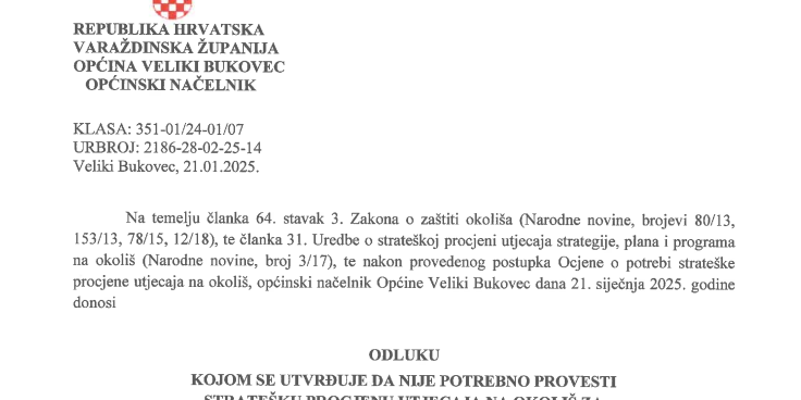 Sukladno odredbama Zakona o zaštiti okoliša („Narodne novine“ broj 80/13, 153/13 i 78/15) i Uredbe o informiranju i sudjelovanju javnosti i zainteresirane javnosti u pitanjima zaštite okoliša (Narodne novine broj 64/08), Općina Veliki Bukovec, a nakon provedenog postupka ocjene o potrebi strateške procjene utjecaja na okoliš za Izmjene i dopune Prostornog plana uređenja Općine Veliki Bukovec, objavljuje informaciju o donošenju Odluke kojom se utvrđuje da nije potrebno provesti stratešku procjenu utjecaja na okoliš za izmjene i dopune Prostornog plana uređenja Općine Veliki Bukovec.