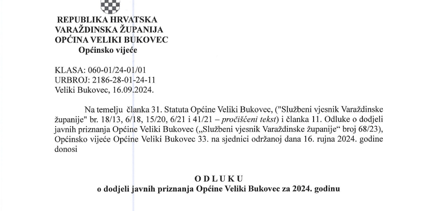 ruj232024NovostiObavijesti JUOOdluka o dodjeli javnih priznanja Općine Veliki Bukovec za 2024. godinu Categories: Novosti, Obavijesti JUOod Općina Veliki Bukovec23. rujna 2024. Share this post Share on FacebookShare on Facebook Share on LinkedInShare on LinkedIn Share on WhatsAppShare on WhatsApp Pin itShare on Pinterest Author: Općina Veliki Bukovec Post navigationPreviousPrevious post:Obavijest o provedbi larvicidne dezinsekcije komaraca na području Općine Veliki BukovecNextNext post:Obavijest o provedbi sustavne deratizacijeRelated PostsJAVNI NATJEČAJ – zimska služba12. studenoga 2025.ANKETNI UPITNIK – Strategija zelene urbane obnove Općine Veliki Bukovec28. listopada 2025.DODJELA STIPENDIJA UČENICIMA S PODRUČJA OPĆINE VELIKI BUKOVEC ZA ŠKOLSKU GODINU 2025./2026.13. listopada 2025.Obavijest o provođenju sustavne deratizacije Veliki Bukovec9. listopada 2025.OBAVIJEST – PRIJAVA ŠTETE OD SUŠE ZA OSIGURANE POVRŠINE13. kolovoza 2025.JAVNU RASPRAVU o Prijedlogu izmjene i dopune Prostornog plana uređenja Općine Veliki Bukovec8. kolovoza 2025.