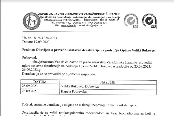 Pročitaj višeObavijest o provođenju sustavne deratizacije Obavijest o provedbi sustavne deratizacije na području Općine Veliki Bukovec