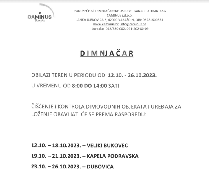 Pročitaj višeRaspored Raspored čišćenja i kontrole dimovodih objekta i uređanja za loženje na području Općine Veliki Bukovec