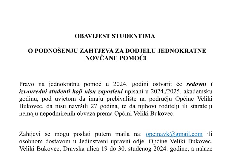 Obavještavaju se studenti s područja Općine Veliki Bukovec da će se podjela jednokratnih novčanih naknada održati dana 14. prosinca 2024. godine u prostorijama Općine Veliki Bukovec u 16,00 sati. Jedinstveni upravni odjel Izvor slike: stipendije: pixabay