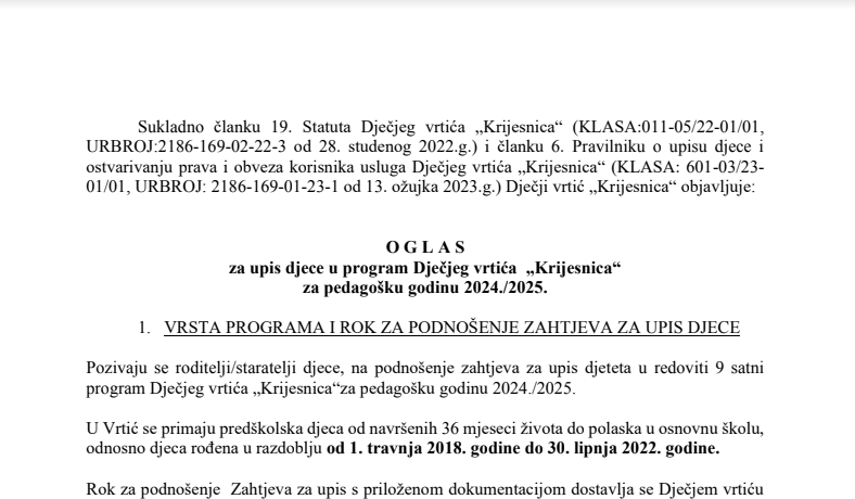Pročitaj višeO G L A S za upis djece u program Dječjeg vrtića „Krijesnica“ za pedagošku godinu 2024./2025.