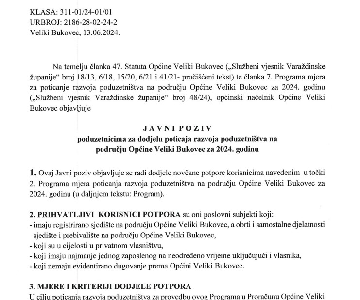 Javni poziv poduzetnicima za dodjelu poticaja razvoja poduzetništva na području Općine Veliki Bukovec za 2024.g Obrazac-Mjera 1. -Potpore poduzetnicima početnicima za osnivanje poduzeća-obrta Obrazac-Mjera 2.-Potpore-za izgradnju-rekonstrukciju-opremanje-poslovnih-objekata ili nabavu-opreme-alata za-rad-proizvodnju Izjava o iznosima dodijeljenih potpora male vrijednosti-OVB
