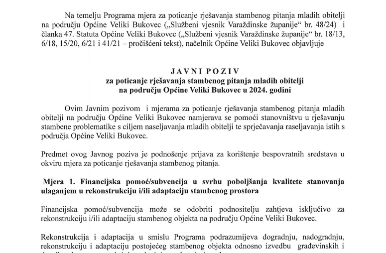 Javni poziv za poticanje rješavanja stambenog pitanja mladih obitelji na području Općine Veliki Bukovec u 2024. godini Izjava-podnositelja-o-prvoj-nekretnini Obrazac 1 – Prijavni obrazac Obrazac-2- Izjava za suvlasnika Obrazac 3 – Privola za obradu osobnih podataka
