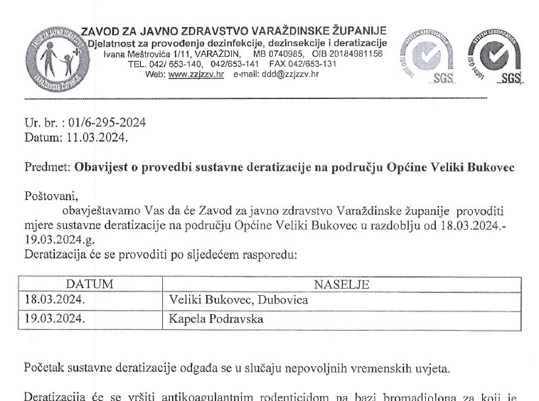Pročitaj višeObavijest o provedbi sustavne deratizacije na području Općine Veliki Bukovec