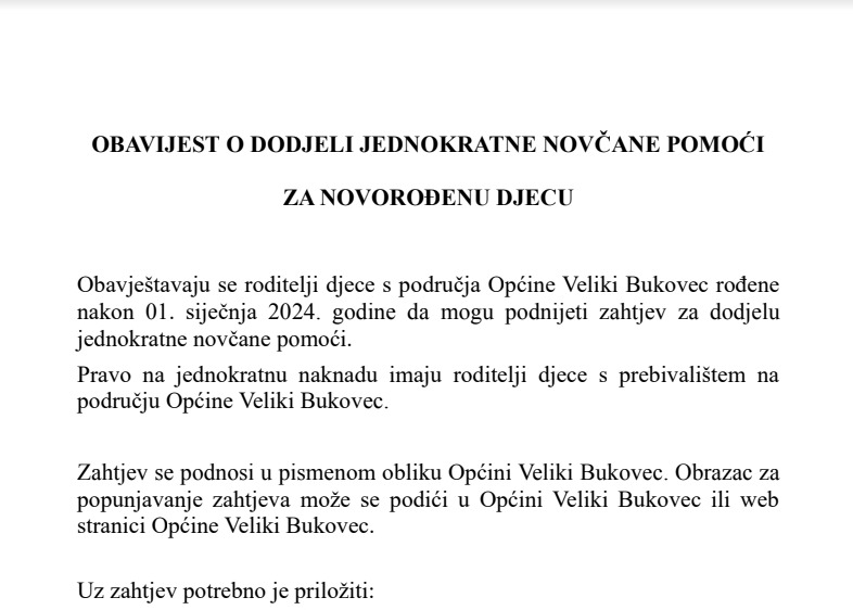 Pročitaj višeZahtjev – jednokratna novčana pomoć roditeljima djece rođene u 2024.g Obavijest novorođena djeca 2024 g.